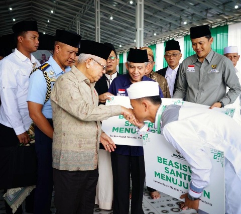 JAKARTA, SinggalangNews.com - Badan Amil Zakat Nasional (BAZNAS) bersama Wakil Presiden RI Prof. Dr. KH. Ma`ruf Amin menyerahkan bantuan "Beasiswa Santri Menuju PTN".
