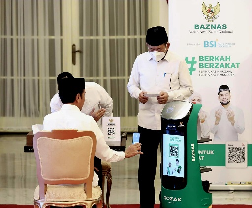 Presiden RI Joko Widodo (Jokowi) menunaikan zakat kepada Badan Amil Zakat Nasional (BAZNAS) dengan menggunakan Robot Zakat (Rozak). Robot Zakat ini.